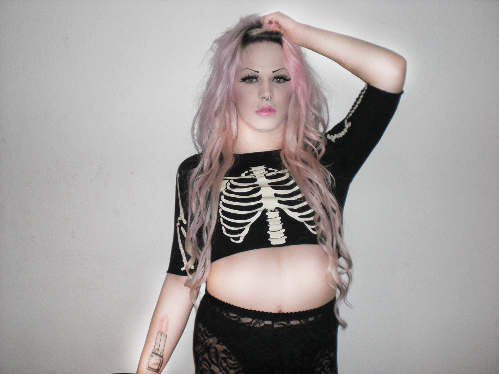 Wearing old skeleton shirt and Miss Selfridge lace tights