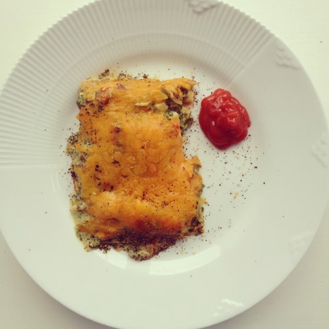 Vegetarian mexican lasagna with loads of spinach, onions, salsa, tomatoes, spices, mornaysauce and enough cheddarcheese to feed a whole family!