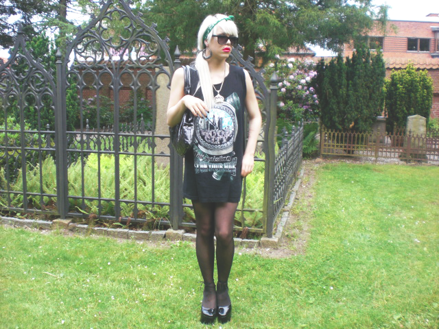 Yesterday a friend of mine and I took a walk in a beautiful graveyard and talked and this is what I was wearing. The dress used to be a really, really big t-shirt in XXXL perhaps, and at the moment I constantly wear it, it’s simple, yet detailed, and it’s nice when the weather is hot. The pendant is bought in Greece last year, and the chain and earrings are both vintage. H&M sunnies, Nelly wedges and vintage bag. My best friend gave me the bandana. Sorry for the bad pose. Haha.